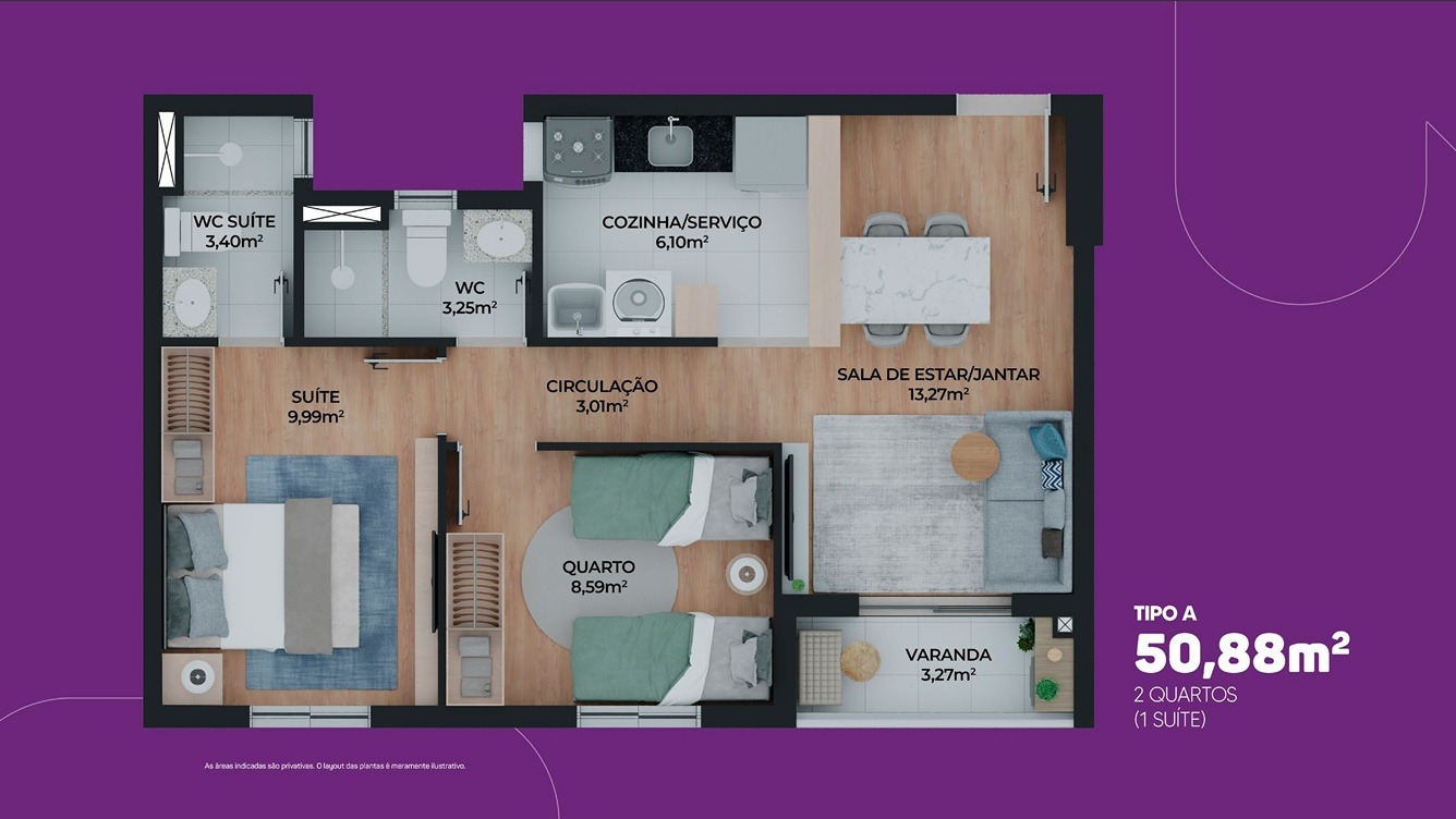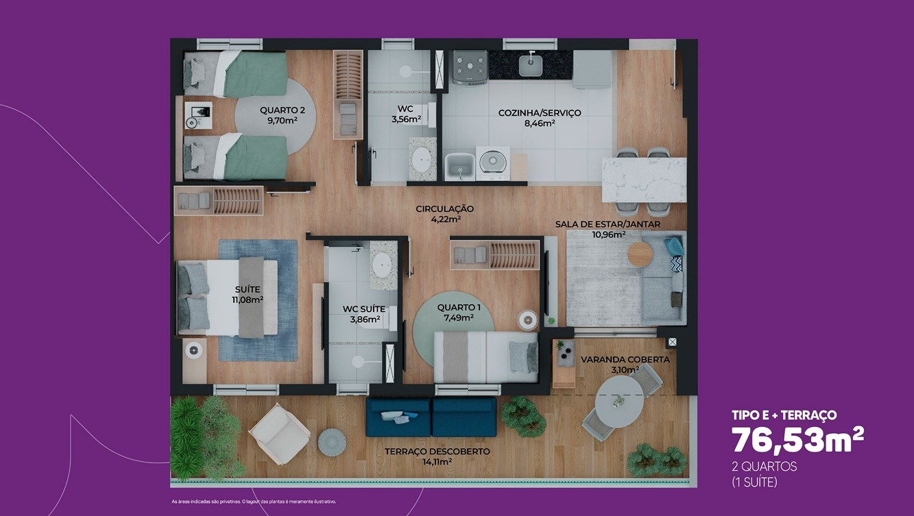 - Área privativa: Unidades a partir de 50,88m² (Planta tipo A) a 76,53m² (Planta tipo E+Terraço)