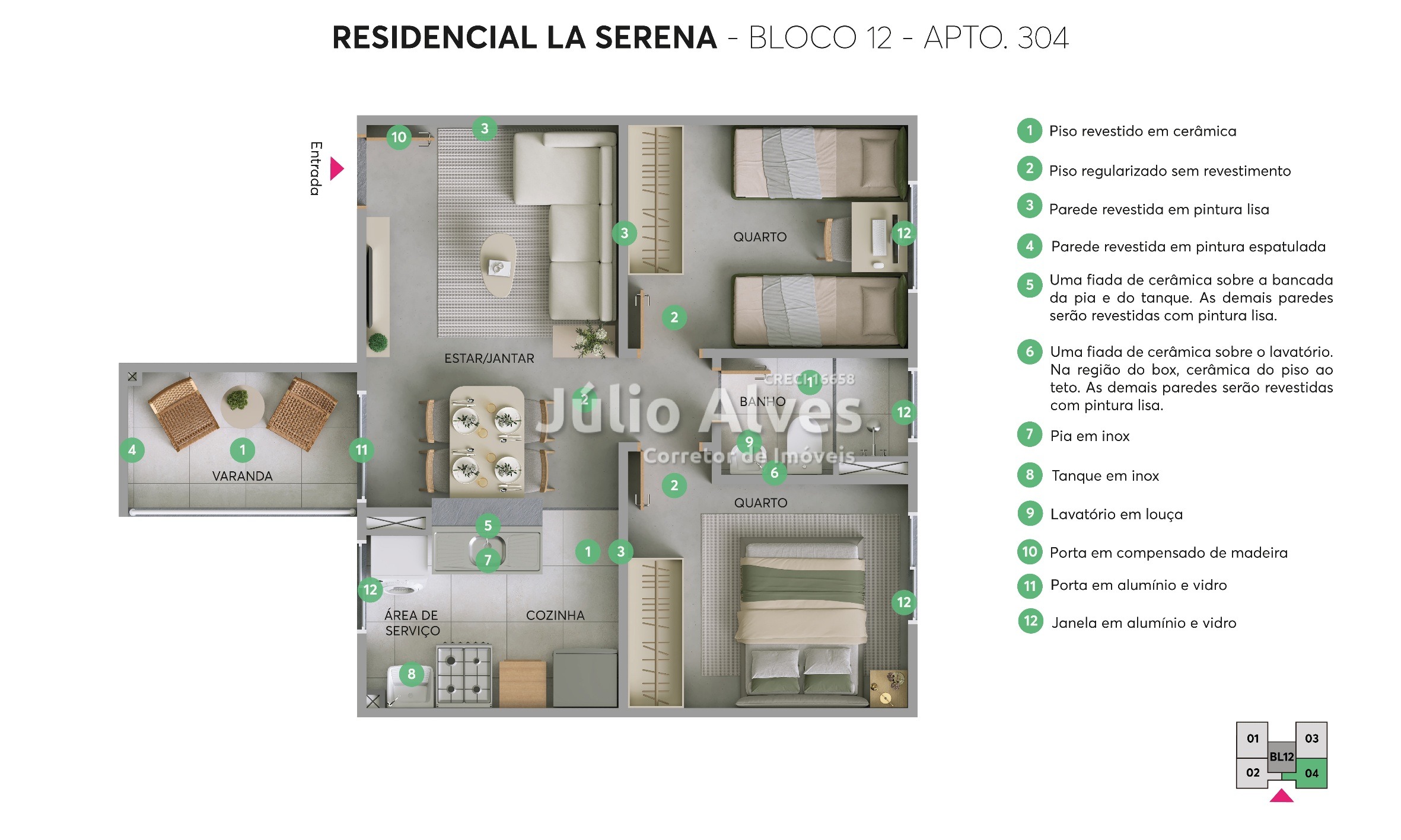 - Algumas unidades contam com área privativa acessória entre 8,15 m² e 24,30 m².